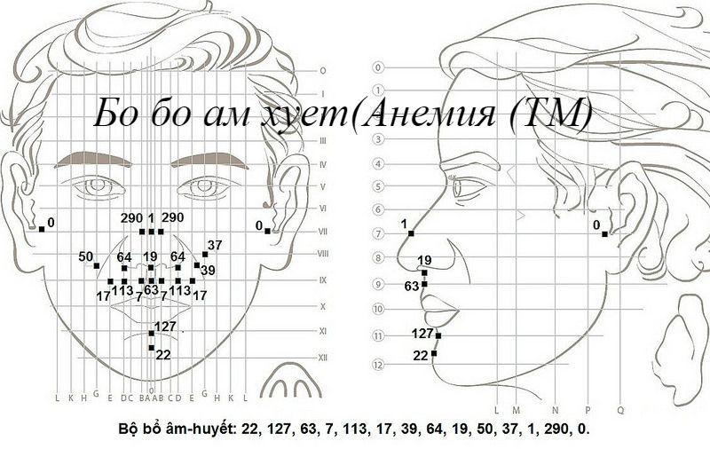 Các điểm chính được sử dụng để điều trị bệnh thiếu máu là: 22, 127, 347, 63, 7, 113, 17, 50, 19, 64, 39, 1, 290, 0.